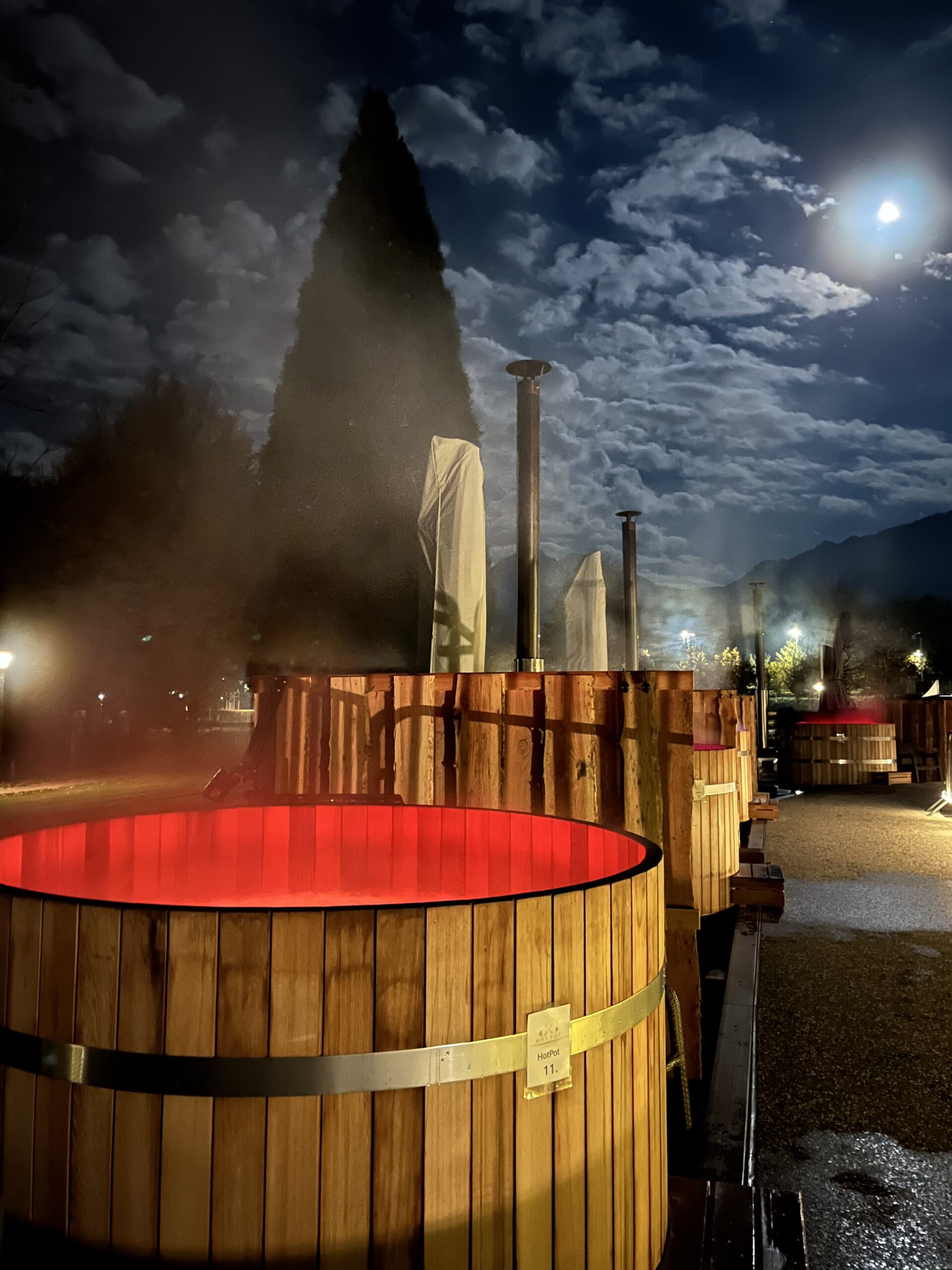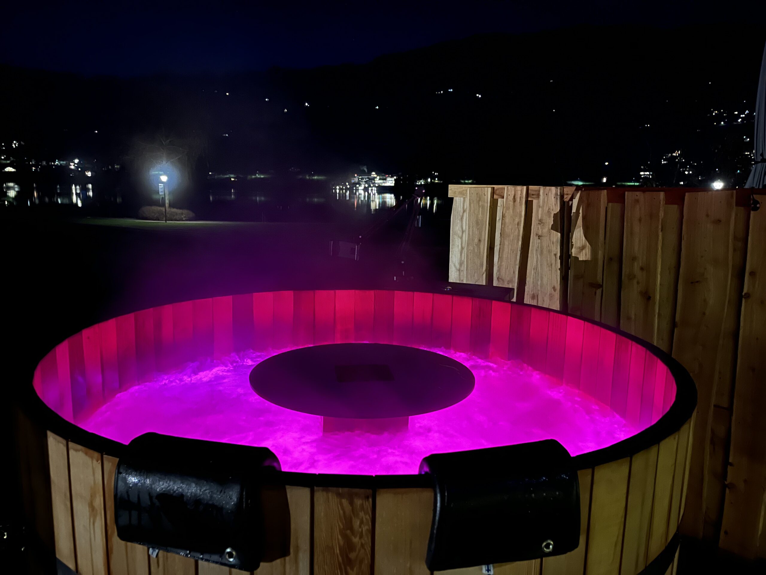 Einchecken, Bademantel, Badetuch und Flipflops fassen, umziehen und die Zeit im HotPot geniessen. Selbstverständlich ist auch jederzeit eine kurze Abkühlung im See möglich.